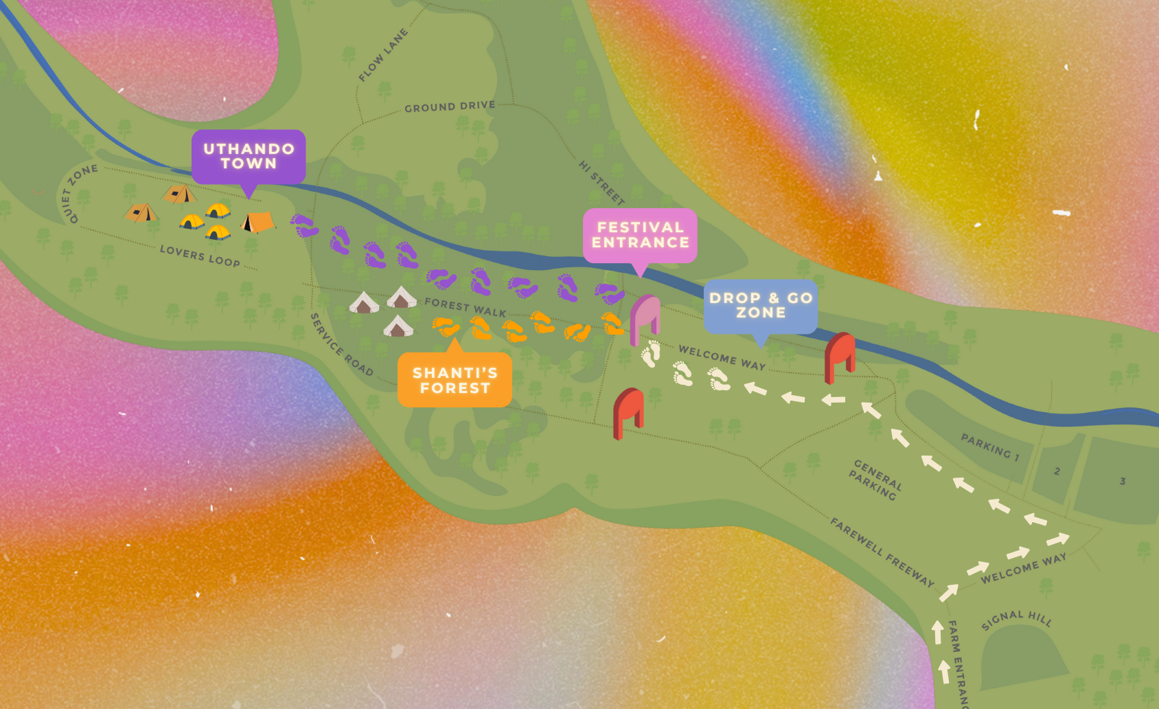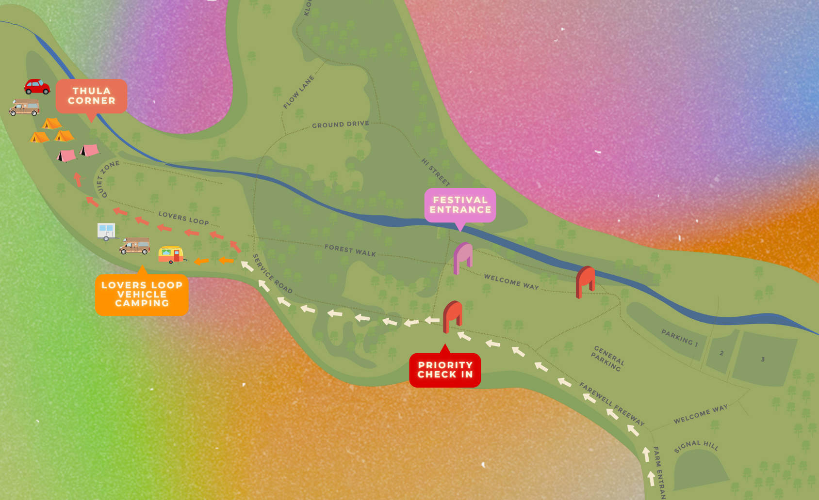 Vehicular traffic is prohibited during the festival. For Thula Corner glamping: only 1 car with a dedicated parking space is allowed through the priority point. Other guests must use the main entrance.